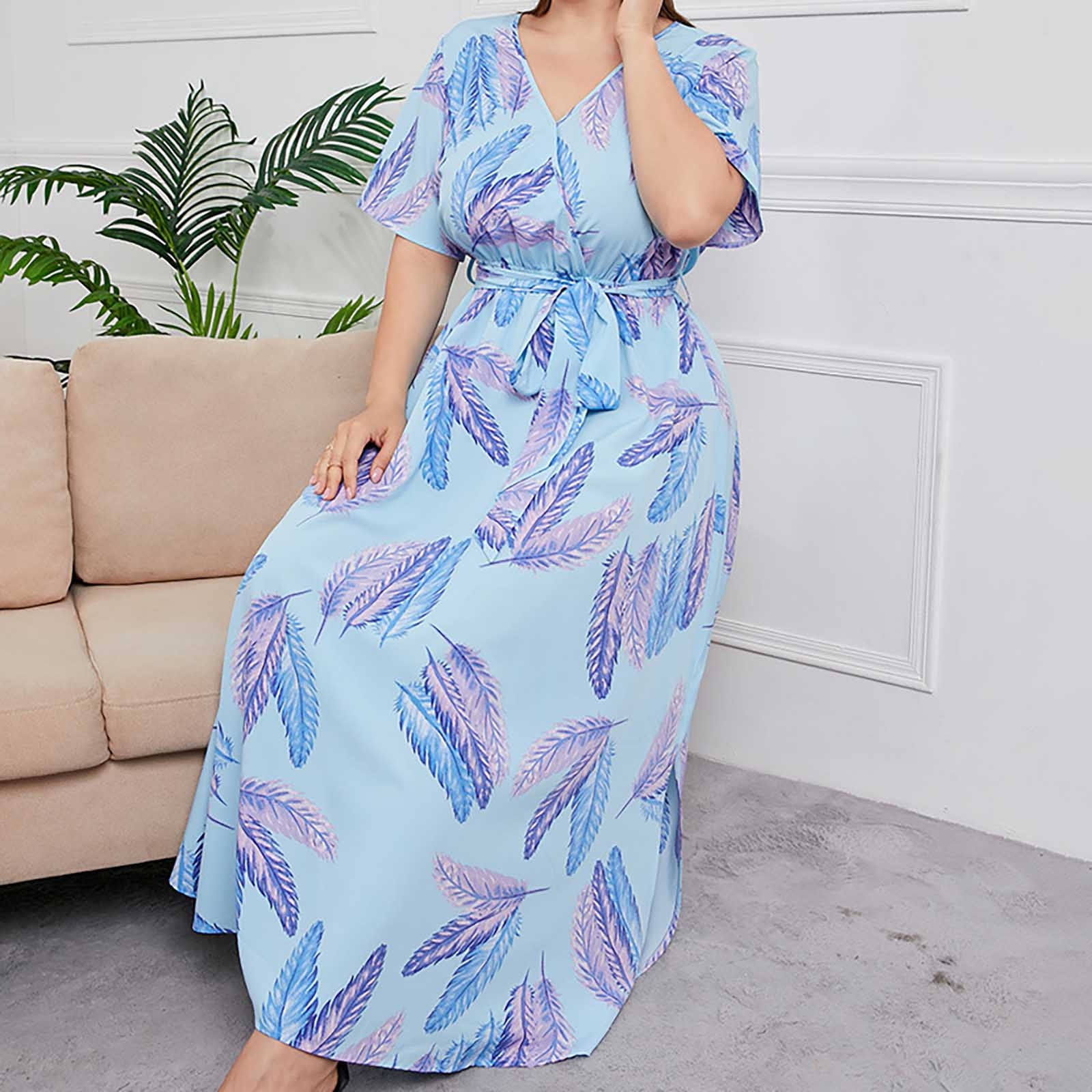 Women S Summer Fashion Casual Sexy Tie Belt Neck Short Sleeve Printed Beach Long Dress Fruugo Uk